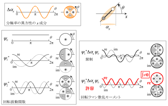 回転ラマンの選択則は散乱モーメントが 0 でない回転量子数の組み合わせ として導かれる. ここでは一次元回転の波動関数を用いて 散乱モーメントを計算する過程を模式的に示している.