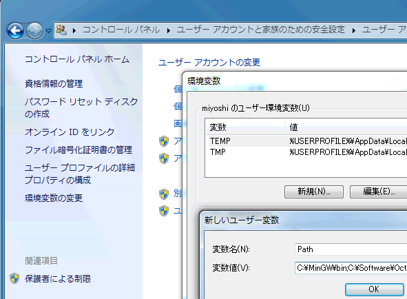 変数名に Path, 変数値に C:\Octave\Octave-4.0.0\bin と入力します.