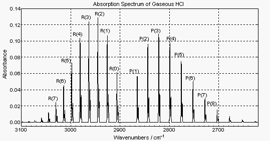 上の図は気体 HCl 分子の赤外吸収スペクトルである。この吸収は HCl